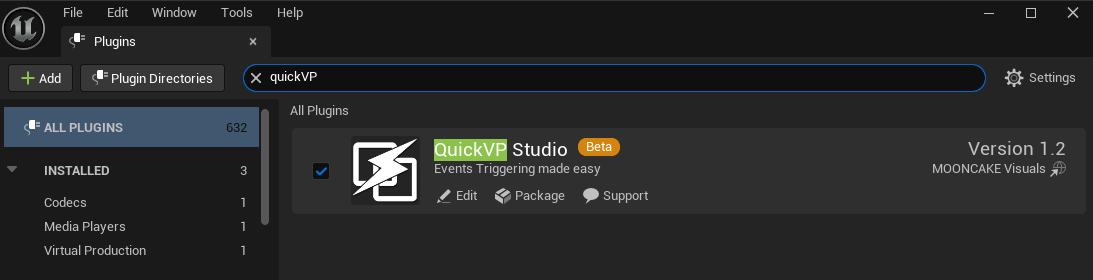 After copying the plugin, enable it by going to theEdit menu → Plugins, type QuickVP in the search box, and activate it.