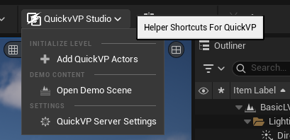 After enabling the plugin, restart the unreal engine editor. Once restarted, you will see a new QuickVP Studio menu in the toolbar with three options:- Add QuickVP Actors Automatically adds the required actors to your scene to get started