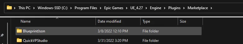 Extract the compressed file, then move theQuickVPStudio folder into your Unreal Engine plugins directory: Engine/Plugins/Marketplace